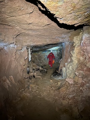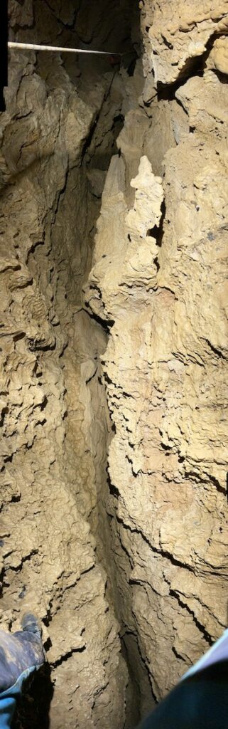 Pendant que Anna et Claude remontent à la surface, nous allons explorer un autre passage avec Glen. À 10 m du P19, au bout de la galerie artificielle, se trouve un petit ressaut d’environ 1,5m, après lequel démarre une autre galerie naturelle. Sur la gauche, un beau puit est équipé avec une main courante (1 spit et un AN) et 3 spits en tête de puit. Je m’y engage avec la corde de 24 m qui me restait à laquelle j’attache une petite corde de 8 m que j’avais aussi emportée. Après une quinzaine de mètres, j’arrive sur une plateforme. Le puits continue sur la droite. Il est équipé avec un spit et un AN. Il s’agit en fait d’une belle faille dont je n’atteint malheureusement pas le fond car la corde est trop courte. Il me manquerait bien une dizaine de mètres. Tant pis, ça sera pour une prochaine fois.