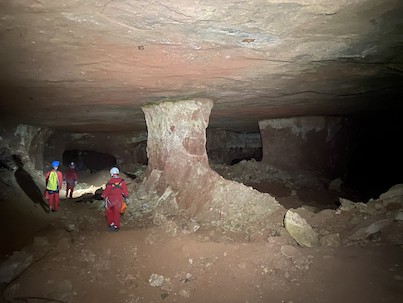 Bien que caché sous des gros rochers au bord du chemin, le premier puit n’est pas difficile à trouver. En bas sur la gauche, passe une galerie de la mine et sur la droite au-dessus d’un petit ressaut, la suite de la cavité joliment concrétionnée. Nous partons tout d’abord sur la gauche pour aller explorer cette fameuse mine. Au bout d’une centaine de mètres, nous débouchons dans l’énorme salle de dépilage. Durant la période d’exploitation, c’était l’endroit où la roche était broyée avant d’être envoyée à Gardanne pour produire de l’aluminium.