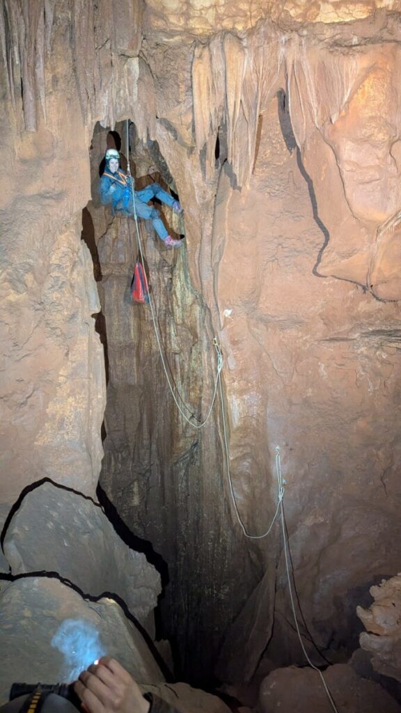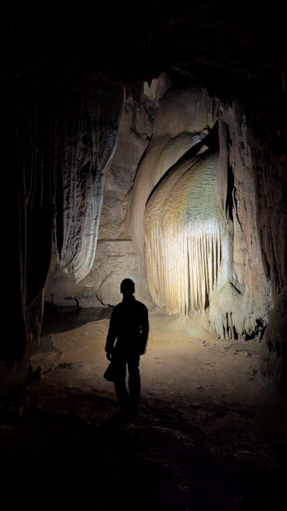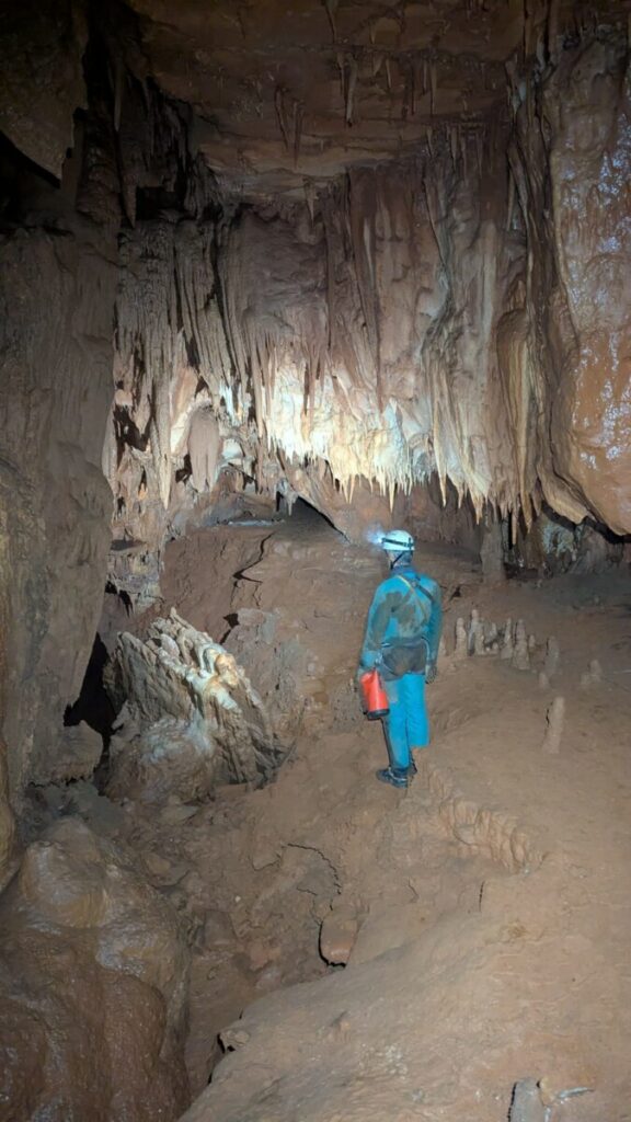 Après cette mise en contexte, on se gare à quelques kilomètre plus bas, à la cotepatière. Il s’agit d’un des réseaux supérieurs du gruyère souterrain de la Claysse. Pas besoin de baudrier mais un casque et une bonne lampe. L’entrée est imposante, avec une échelle scellée dans la roche. S’ensuit une longue galerie d’environ 2km dans laquelle on marche sur du sable et des galets, reliques du passage de la rivière. A plusieurs endroits, on observe de belles concrétions et même des ammonites et des rostres de bélemnites fossilisés au plafond. Après deux heures d’exploration, on arrive dans une zone plus humide avec des grandes vasques d’eau et de la boue. Seuls Éric, Olivier et Glen décident de se salir. Bientôt on se retrouve en face du lac Gaupillat. Un canot en plastique est posé contre le mur. Il ne faut pas beaucoup d’hésitation à Glen pour le mettre à l’eau et partir à la traversée du lac! Avec Olivier on se demande ce qui se passe car on entend comme des explosions. On se demande si il ne s’agit pas du son et lumière qui a lieu un peu plus loin dans la cavité, dans la zone aménagée de la Cocalière. Après 10min, Glen est de retour: « non, non, je n’ai pas entendu d’explosion ». Encore une illusion due à la géométrie de la cavité .